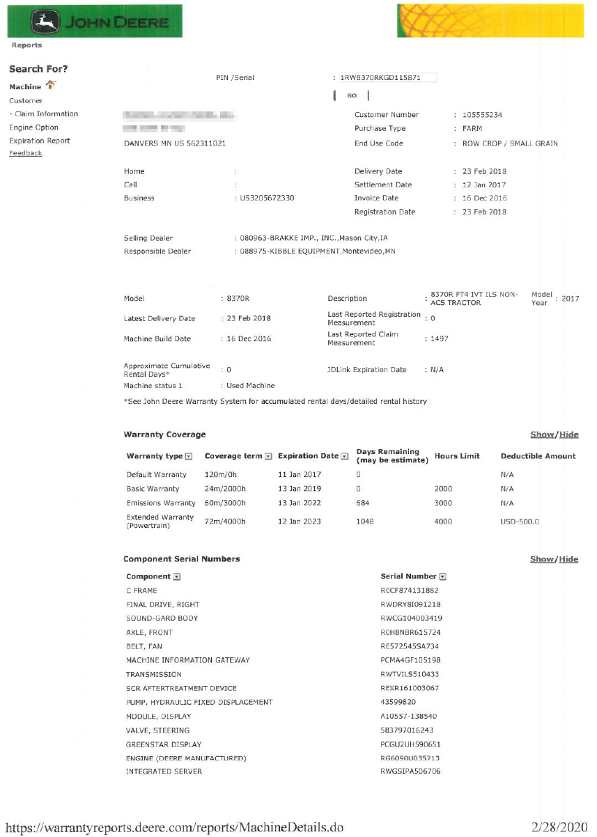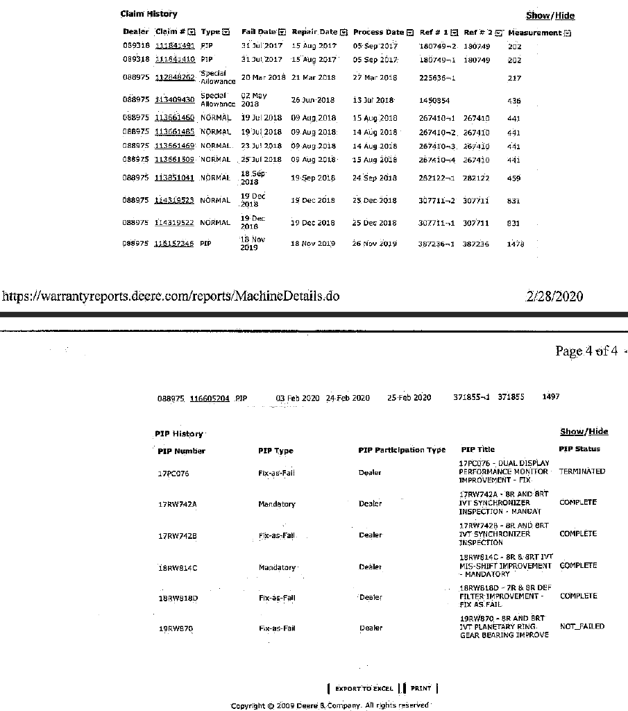 - Annual 114-hour inspection by Midwest Machinery and Wersinger Ag Service (former Midwest Machinery tech)